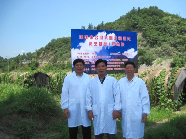 公司董事长余春赋和灵芝专家沈业寿教授及基地负责人李文海在一起