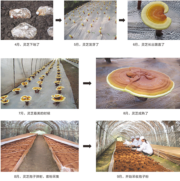 灵芝,誉为仙草,有其复杂的生长过程。从灵芝的选种,育种,培种,菌丝,菌棒下地及生长,成熟到弹粉,收集需一年时间,工序繁多。