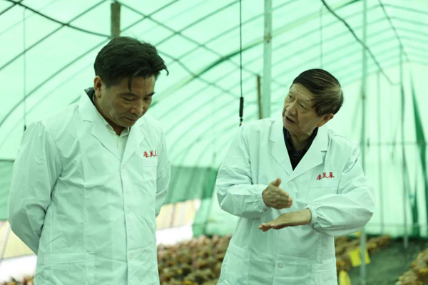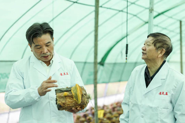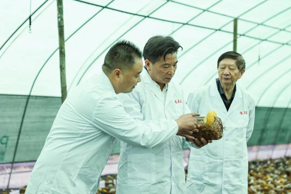 集团技术总顾问沈教授走进基地大棚,详细了解基地桑黄生长情况,重点调研桑黄种植技术、病虫害存在问题,确立科研攻关课题,并提出具体技术指导建议。
