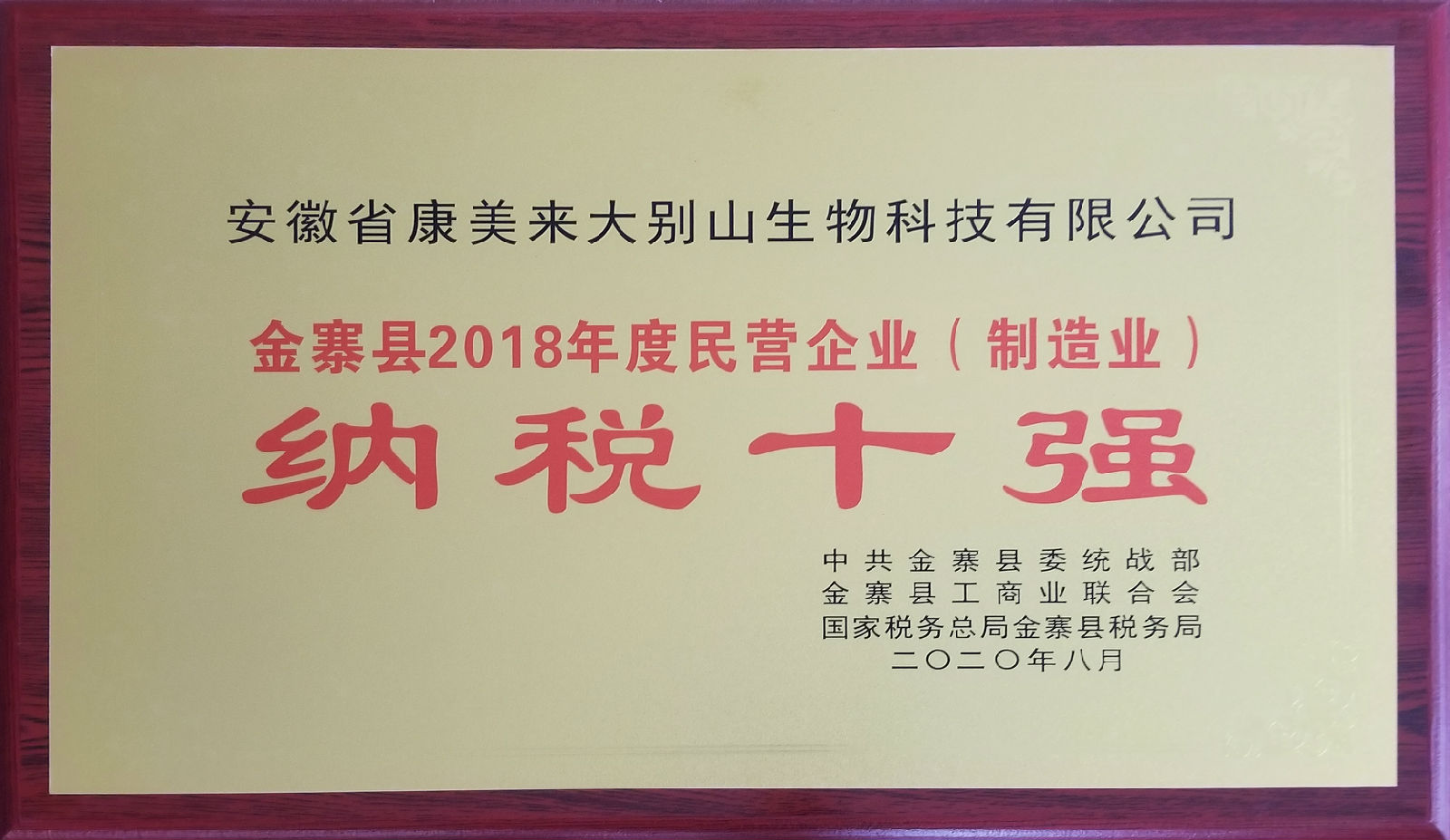 近日,中共金寨县委统战部、金寨县工商业联合会、国家税务局金寨县税务局联合开展了金寨县民营企业纳税排序工作,依据注册地在金寨县的民营企业2018年度缴纳的税收实绩,授予安徽省康美来大别山生物科技有限公司“金寨县2018年度民营企业(制造业)纳税十强”称号。