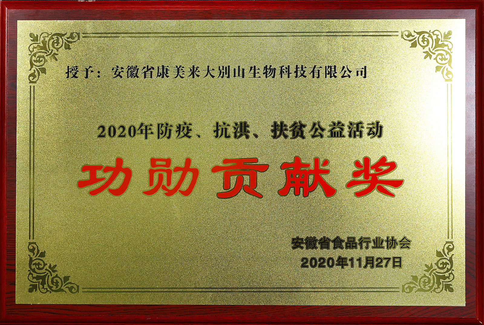 2020年11月27日,2020年度安徽省食品行业“防疫、抗洪、扶贫”公益表彰大会 在安徽合肥滨湖会展中心举行。安徽省食品行业协会根据康美来公司在2020年防疫、抗洪、扶贫方面的突出贡献,授予安徽省康美来大别山生物科技有限公司“2020年防疫、抗洪、扶贫公益活动功勋贡献奖”称号。