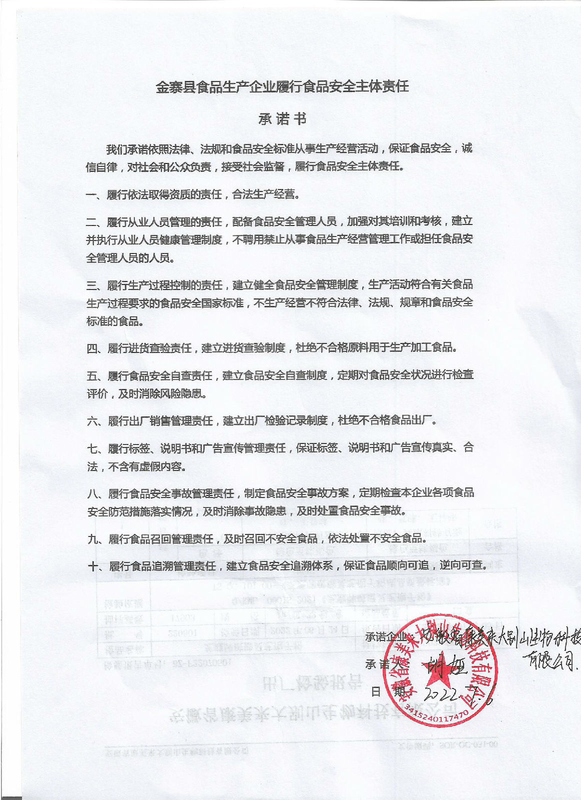 金寨县食品生产企业履行食品安全主体责任承诺书