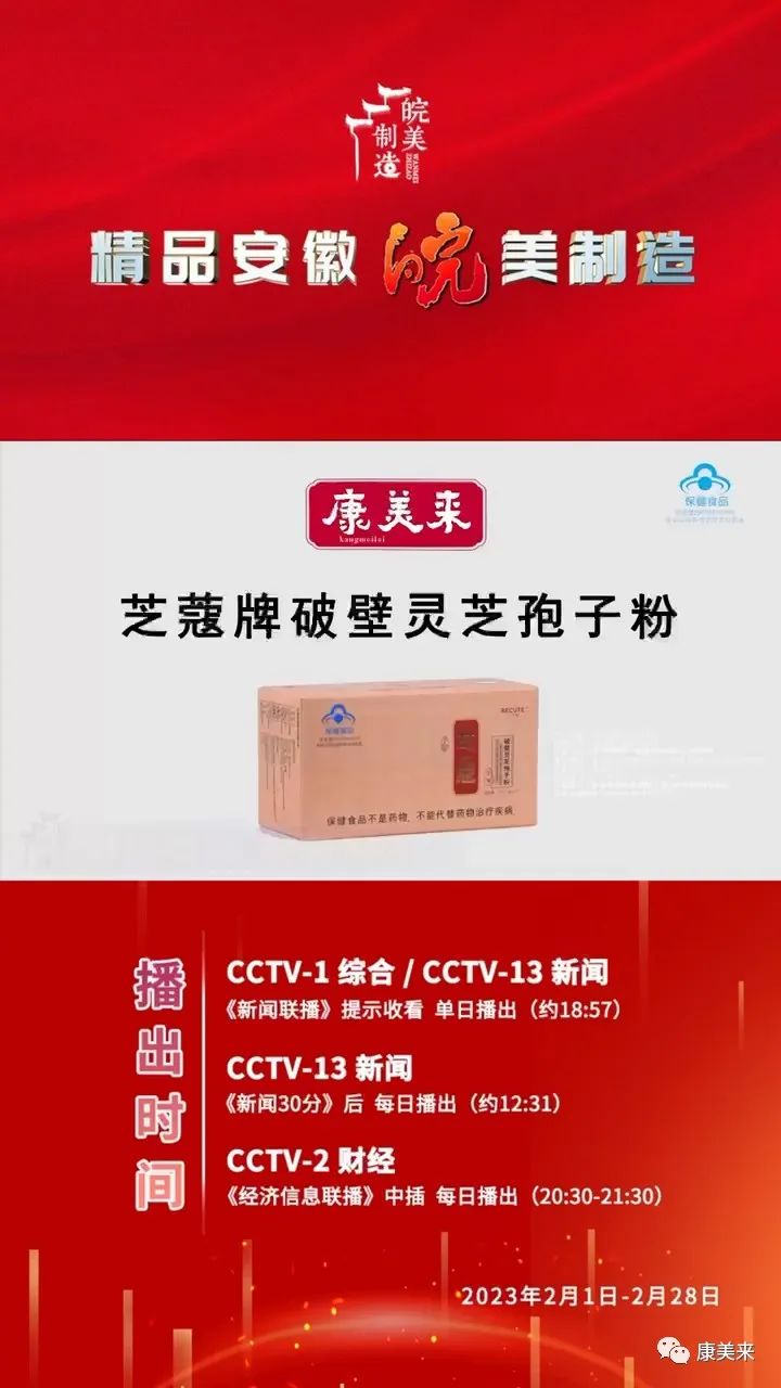 2月1日,康美来破壁灵芝孢子粉登陆央视CCTV1、CCTV新闻、CCTV2等黄金频道播出广告,这是继2022年11月后时隔2个月再次在央视三个黄金频道黄金时间推广公司和产品,以“精品安徽”大品牌的形象广告全国。