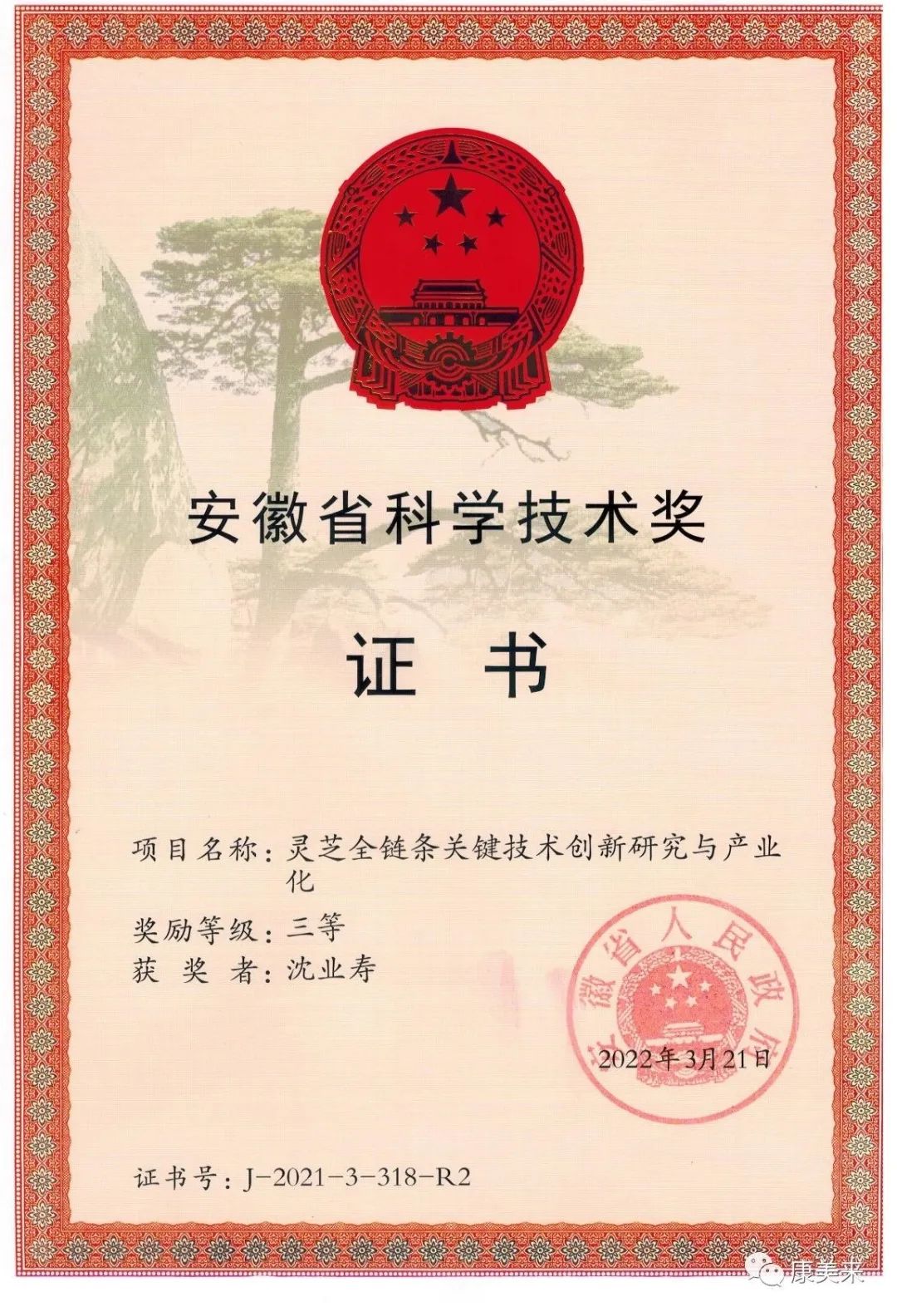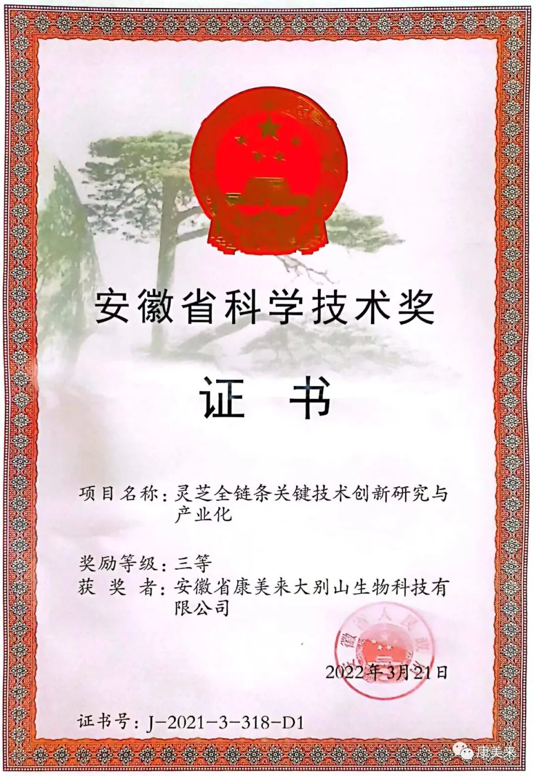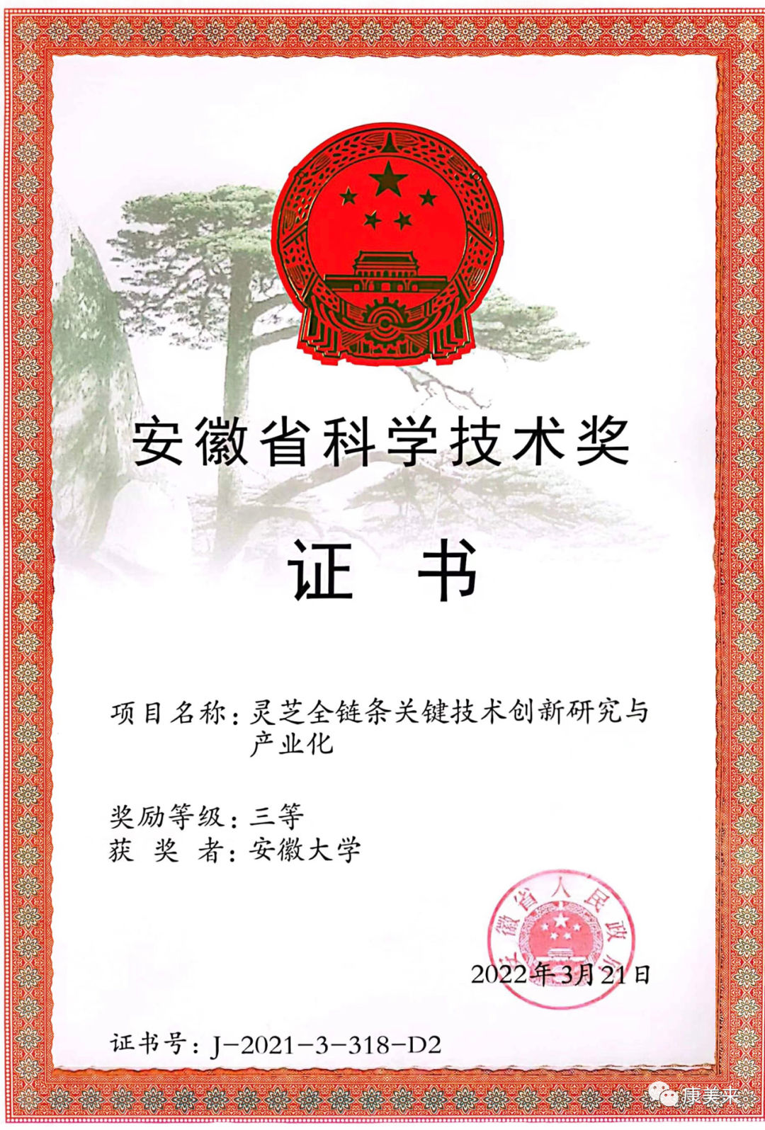 安徽省人民政府向安徽省康美来大别山生物科技有限公司、安徽大学沈业寿教授等单位和个人颁发“安徽省科技技术奖”证书,这是康美来公司与安徽大学开展产学研合作十五年在大别山灵芝研究领域取得的重大成就,得到省、市、县政府的高度肯定。
