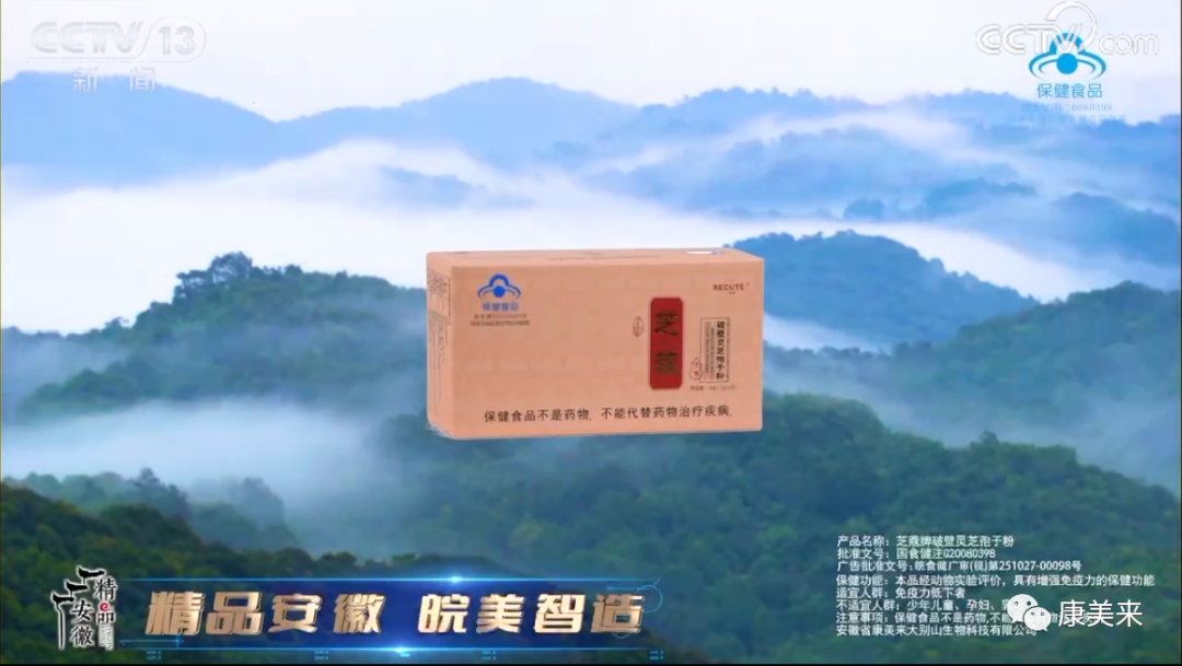康美来破壁灵芝孢子粉作为政府推荐的“精品安徽”品牌多次登陆央视广告,今年11月正在CCTV新闻等频道播出。