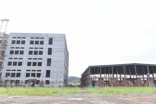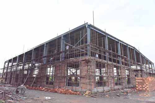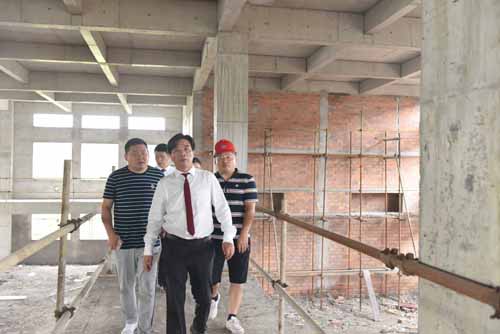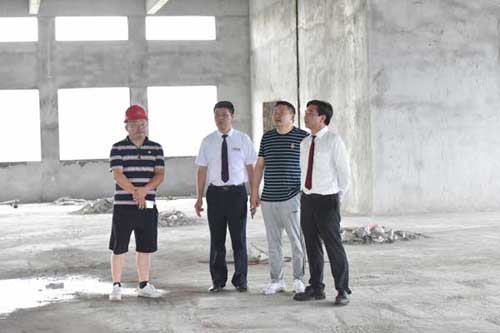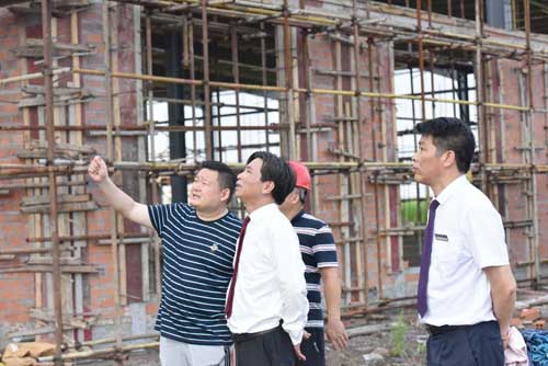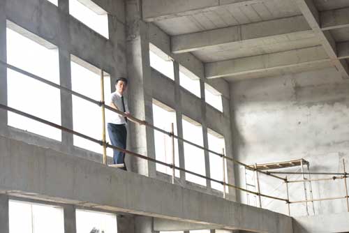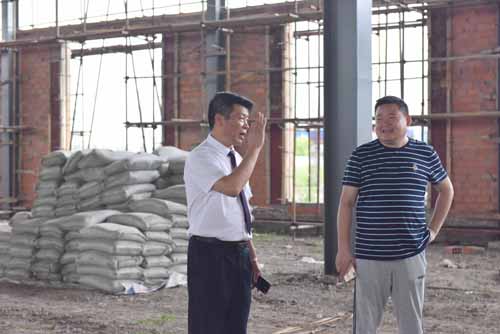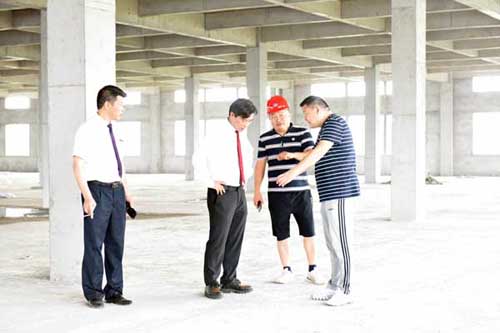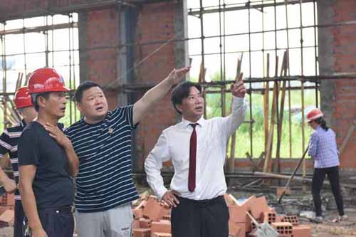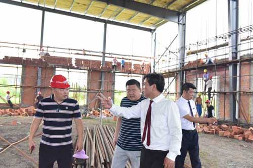 然后余董进入正在建设的第二幢厂房培训中心。培训中心钢结构厂房目前正在墙面施工中,工人们正在垒砖砌墙。