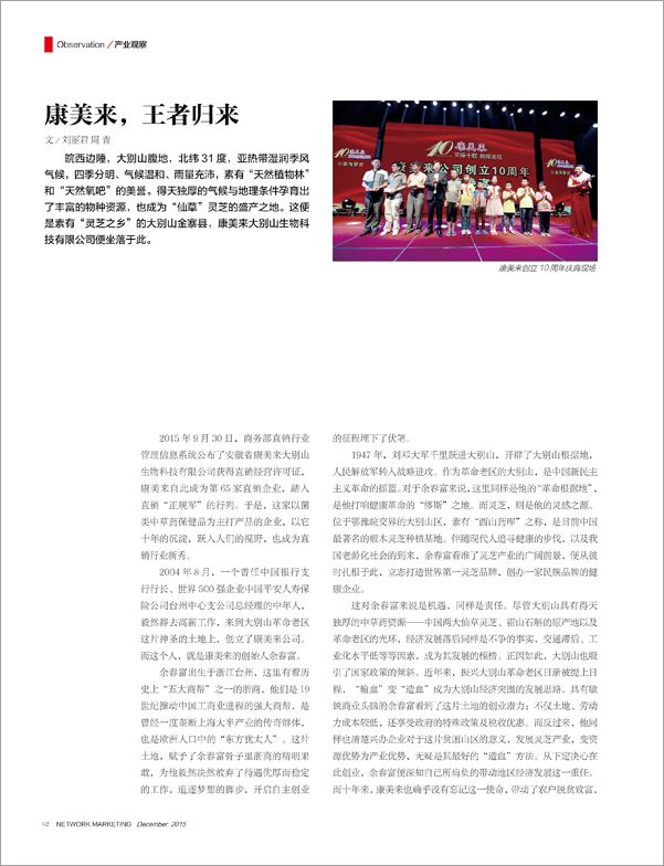 候普传媒《直销》杂志2015年12月刊总130期报道康美来公司。