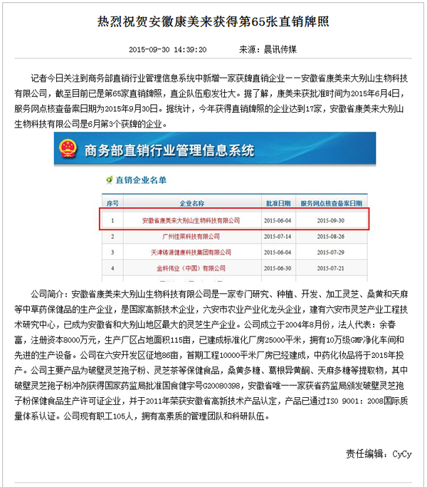 热烈祝贺安徽康美来获得第65张直销牌照