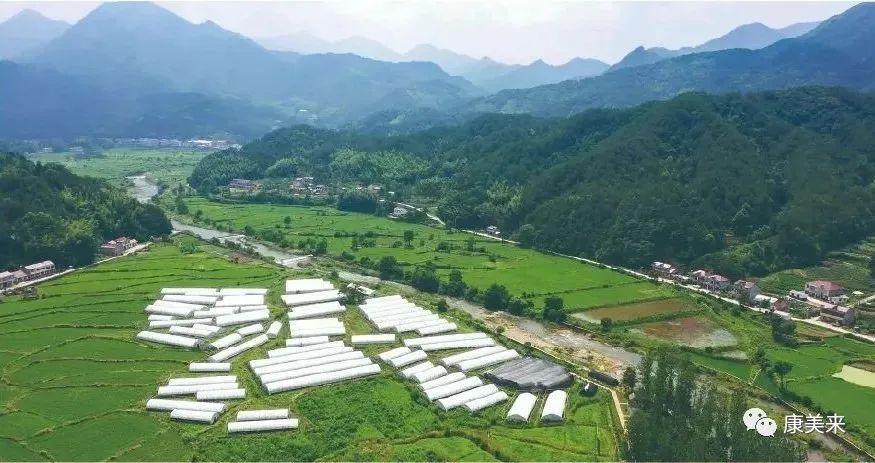 康美来药材基地四面环山,森林、湶水、山谷、蓝天、白云、灵芝、桑黄,以及云湶谷有机水稻,构成一幅美丽的乡村画卷。