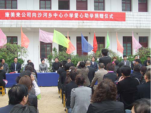 2011年4月16日上午,安徽康美来大别山生物科技有限公司董事长余春富率公司部分职工及销售区域经理100余人到沙河乡中心小学举行爱心助学捐赠活动。县委常委、副县长陈友平及县扶贫办党组成员张文等参加捐赠仪式。