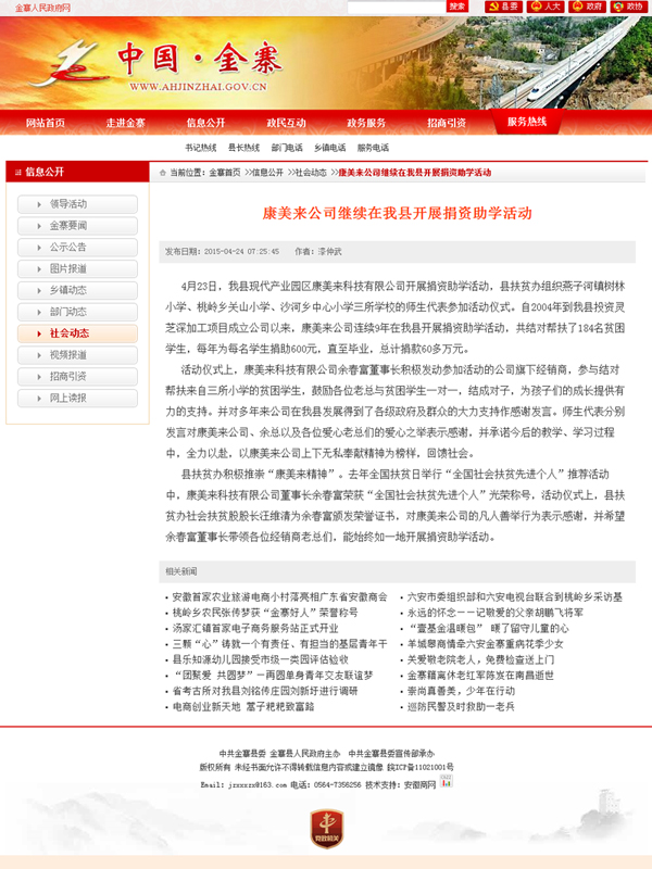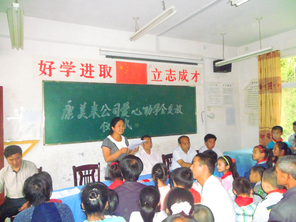 2015年4月23日,我县现代产业园区康美来科技有限公司开展捐资助学活动,县扶贫办组织燕子河镇树林小学、桃岭乡关山小学、沙河乡中心小学三所学校的师生代表参加活动仪式。自2004年到我县投资灵芝深加工项目成立公司以来,康美来公司连续9年在我县开展捐资助学活动,共结对帮扶了184名贫困学生,每年为每名学生捐助600元,直至毕业,总计捐款60多万元。